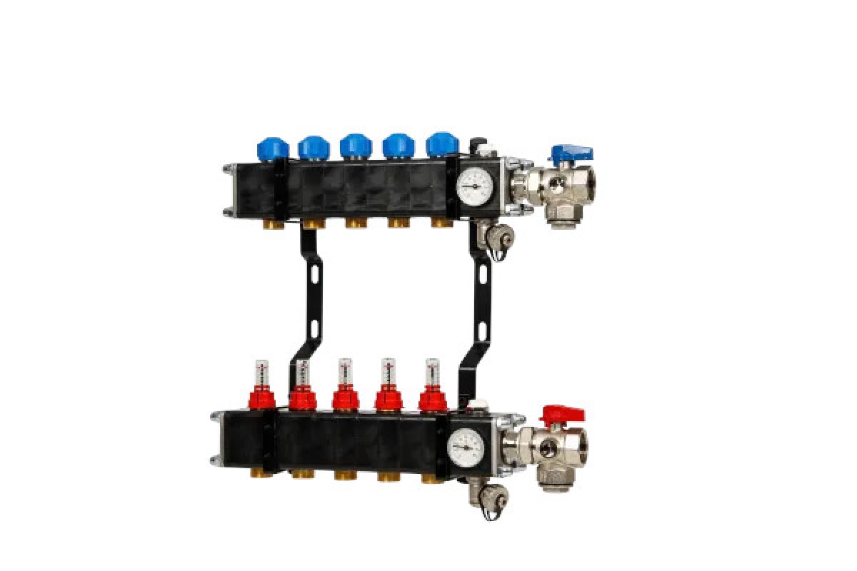 Geschieden kunstof vloerverwarming verdeler voorzien van 5 groepen. Deze verderdelen is geschikt voor laag temperatuurverwarming en koeling. Omdat de verdeler van kunststof is zal deze niet roetsten. De prijs is inclusief montage en de benodigde koppelingen om de verdeler aan te sluiten op de aanwezige vloerverwarming.